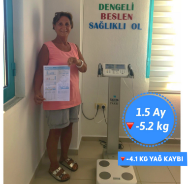 5.2 kilonun, 4.1 kilosunu yağ olarak kaybederek yüksek oranda yağ kaybı sağladık. Yüksek yağ kaybı ile birlikte, diyete başlamadan önce yağ oranı %34.4 iken, şuan ise %30.7 yağ oranına sahip.
