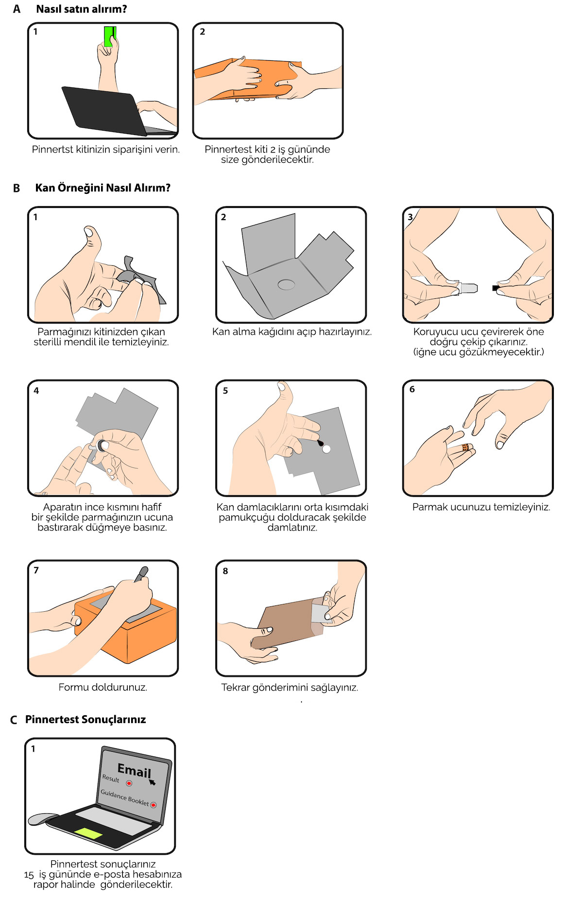 Pinnertest kullanımı ve anlaşılması kolay bir testtir. Sipariş ettikten test kitinizi anında göndeririz. Test kitini aldıktan sonra, kullanıcı dostu kılavuzu okuyarak parmağınızın ucundan kan örneği alarak testi yapabilirsiniz. Aldığınız örneği laboratuvarımıza karşı ödemeli olarak gönderdikten sonraki 15 gün içerisinde e-mail aracılığıyla test sonuçlarınızı elde edeceksiniz.